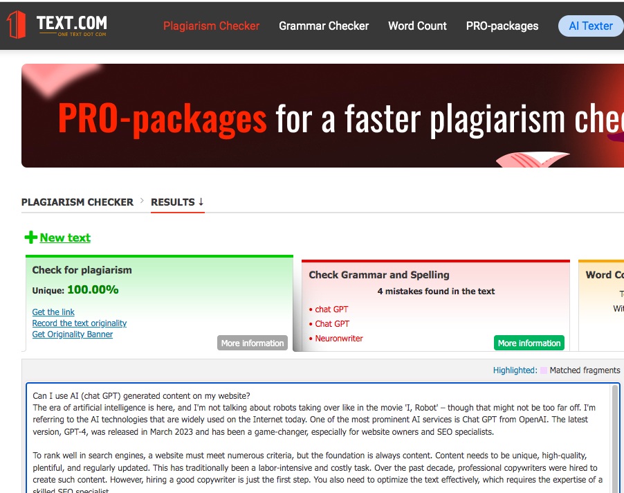 For those who don’t understand the concept of AI-generated text uniqueness, let’s clarify. While ChatGPT can produce text that passes plagiarism checks on popular Canadian services like Neuronwriter with 100% uniqueness, this doesn’t mean the text is unique to Google. That’s why it’s important to use a more thorough plagiarism checker, like the previously mentioned 1Text.com.
