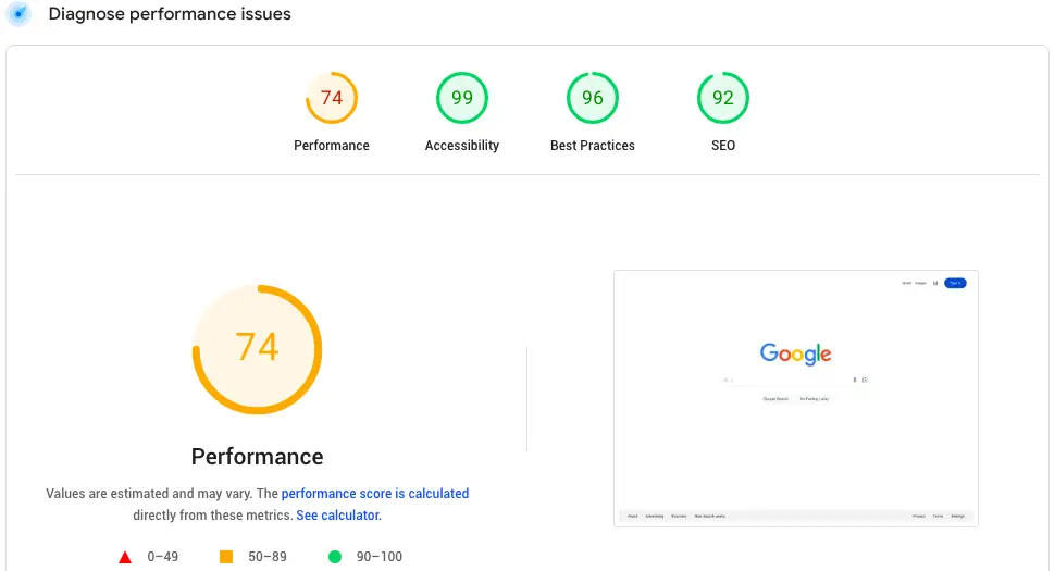 Next, you’ll see a score based on four criteria: Performance, Accessibility, Best Practices, and SEO.