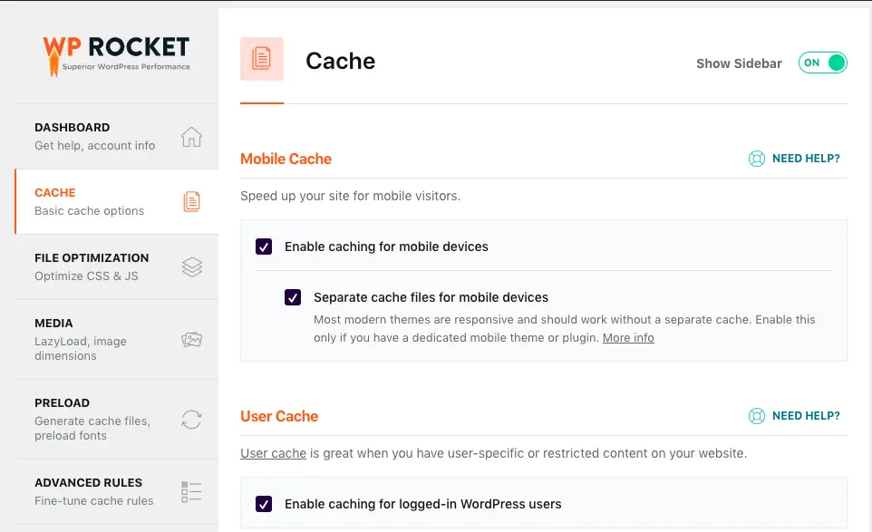 To enable browser caching, you can contact your hosting provider, as many offer this functionality. Alternatively, you can add some lines of code to your site manually. The best option, however, is to use a plugin like WP Rocket (though it is paid). Once installed, you can navigate to the appropriate tab – Cache – to get started: