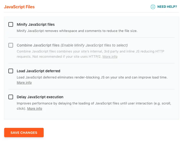 Next is JavaScript minification. Be cautious here, as many sites experience errors, and in some cases, the site may even load noticeably slower:
