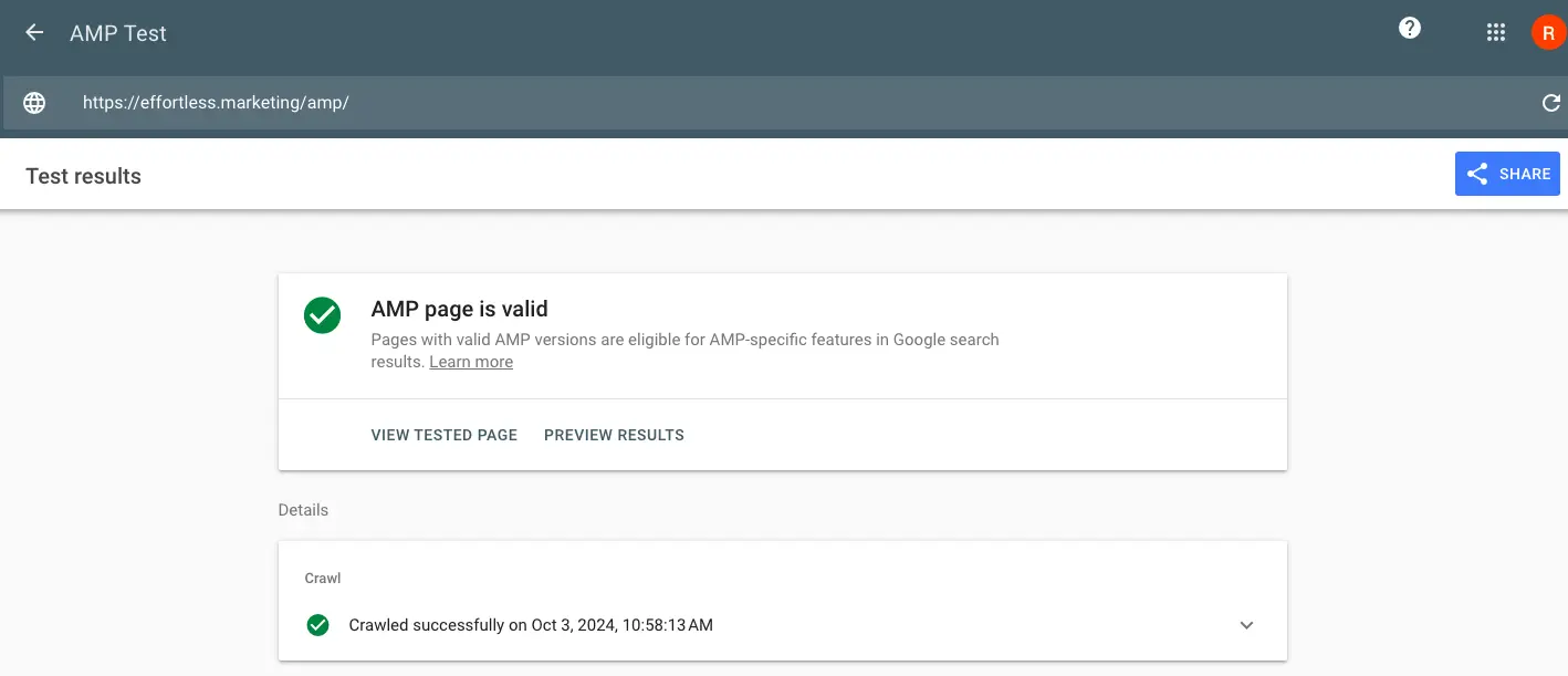 Once AMP has been implemented, it is important to test it through a validator – https://search.google.com/test/amp: