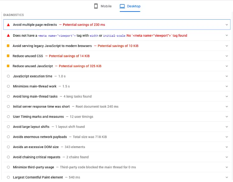 Let’s start with the last metric. A site’s SEO score indicates whether the page meets Google’s guidelines.