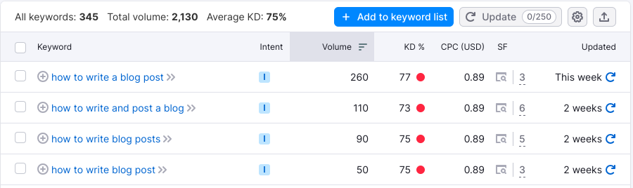 We can see that each keyword has a lot of searches, and the Keyword Difficulty (KD) is very high. KD is measured from 1 to 100 – the higher the number, the harder it is to rank well quickly without additional efforts like link building.