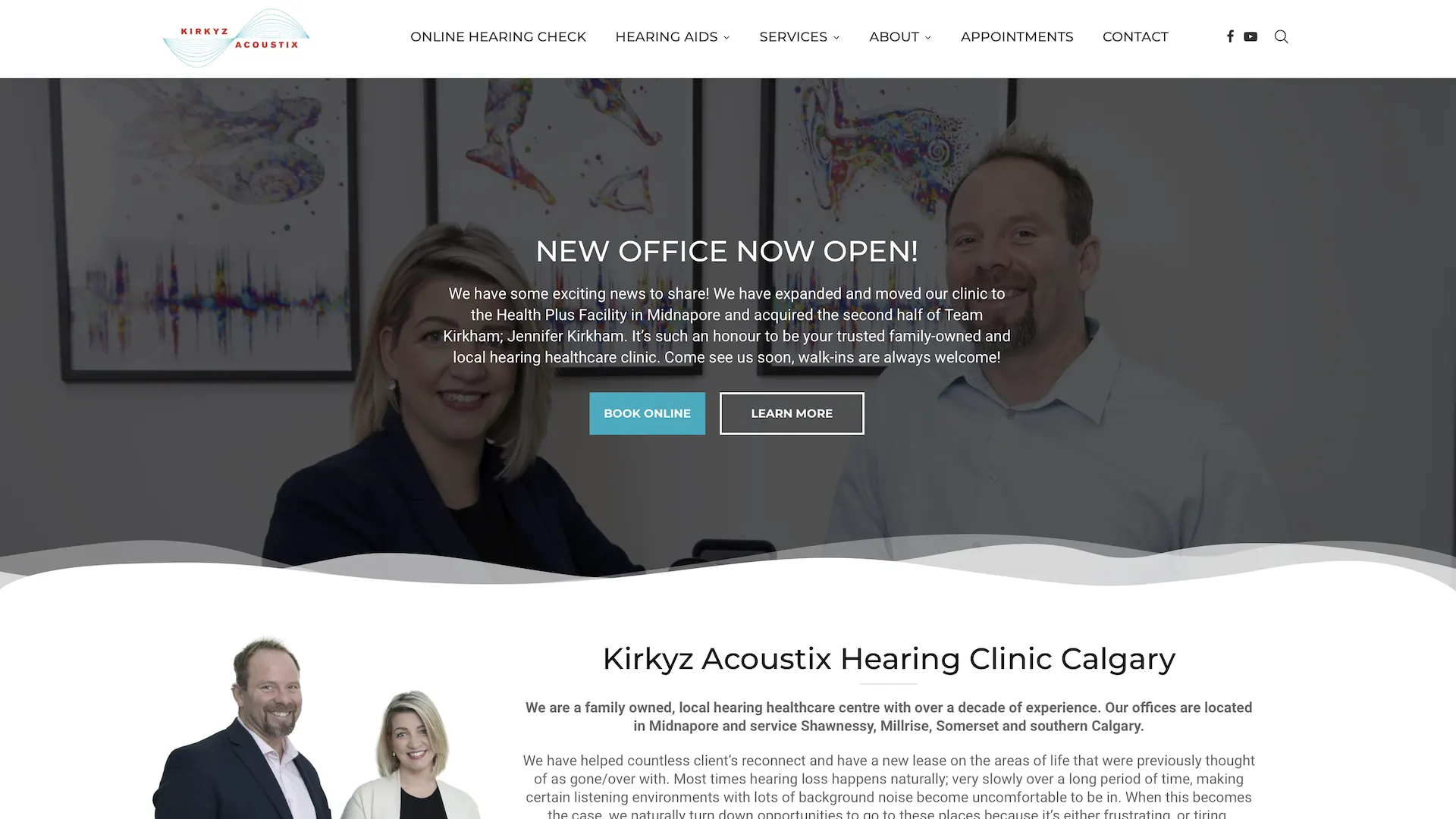 Kirkyz Acoustix is a family-owned hearing healthcare clinic in Calgary offering comprehensive hearing services, including hearing tests, hearing aid fittings from major brands, ear wax removal, maintenance, adjustments, and hearing protection with personalized onsite care.