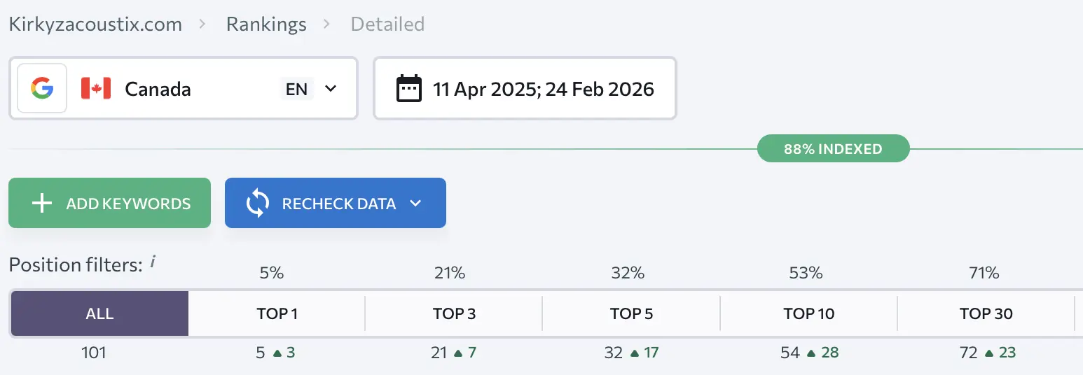 - 28 keywords in Top 10, 17 in Top 5, 10 in Top 3